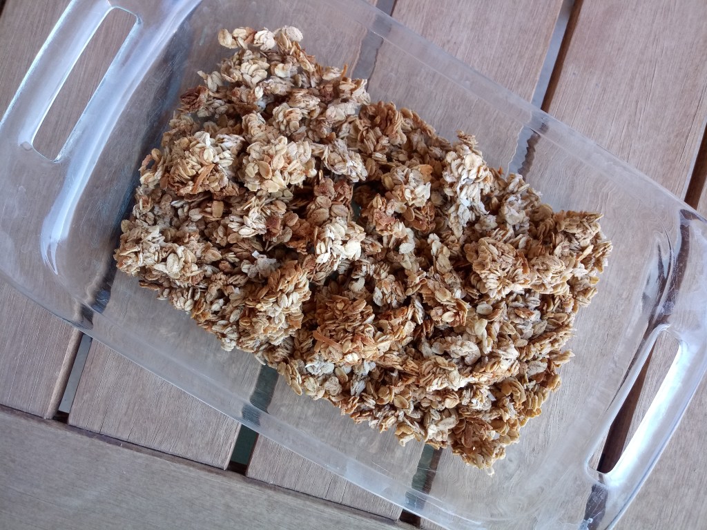 *using a dish instead of a pan allows the granola to cook thoroughly without being browned too quickly, this will result in crispy golden clusters.*