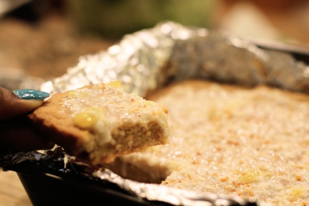 Hi, guys! I know it has been a while, and I am so sorry for the wait. Today, I will be sharing with you a recipe for pineapple coconut blondies. The blondies consist of a light colored cookie base, with slightly sweet undertones. On top, I have designed a white icing mixed with coconut shreds and pineapple juice for a pina colada flavor, and a sprinkle of oven toasted coconut to top it off. Of course these blondies have in no dairy, and they are on the healthier side. Enjoy 🙂